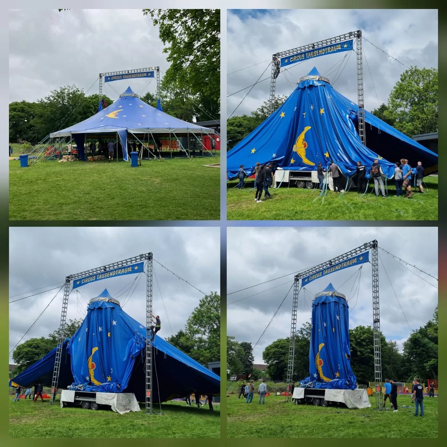 Bereits am Montag reisten die Artisten mit ihren Wohnwagen und Transportern an. Insgesamt 13 Fahrzeuge, darunter das große blau-gelbe Zirkuszelt, machten aus dem Schulhof ein echtes Zirkusdorf. Schnell begannen die Aufbauarbeiten, bei denen auch viele Eltern tatkräftig halfen.Innerhalb weniger Stunden stand das Zelt - und die Vorfreude war greifbar!